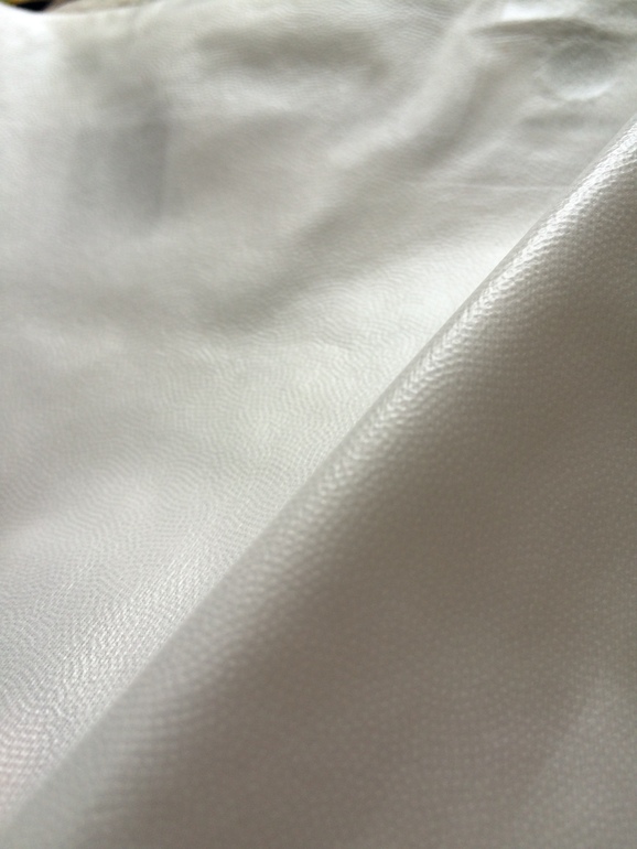 И если ее пощупать, она какая-то слишком скользкая. В общем любопытство взяло верх, я распорола подклад по шву и оказалось, что он со стороны основной ткани (как бы внутри) поэлитиленовый. Это хорошо видно на фото: