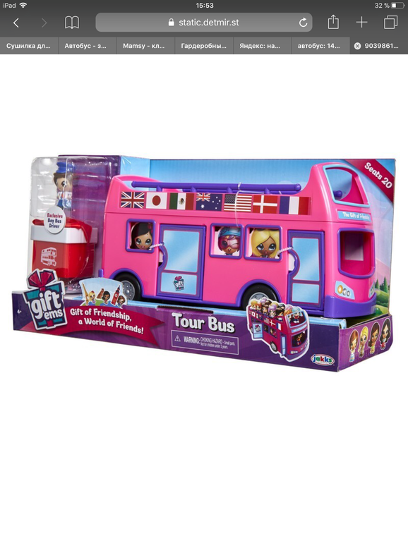 У нас типа такого. Двери открываются, водитель правда уже на своем рабочем месте). В длину где-то 38 см. Но сиденья маленькие. Нужны маленькие игрушки.