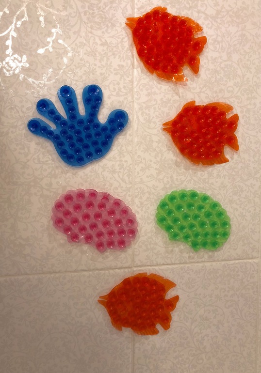 У нас игрушек для ванны море, тк мой водоплавающий от корней до кончиков, иногда мне кажется что у него можно найти жабры )) Но самый хитовый хит это вот такие липучки, у нас из много разных цветов и форм. Самая главная их фишка в том, что на них можно лепить другие предметы, от мячиков и игрушек, до лейки душа ))