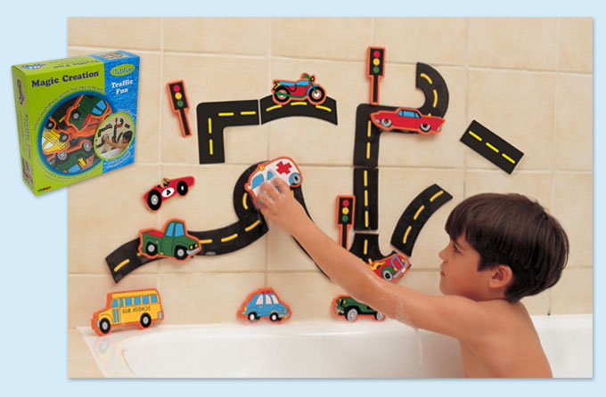 Стикеры для ванной, как на первом фото. И лейка. До сих пор с ними играет в ванной.