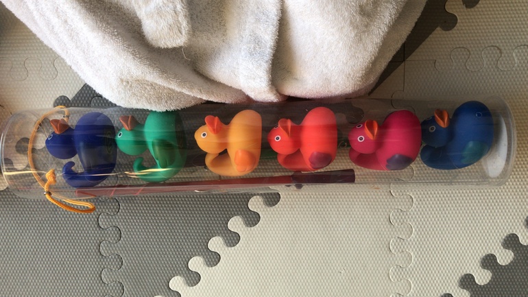 Ребенок помладше, поэтому пока крышки от фрутоняни - наше все)) Выставляю в контейнер, он там сам разбирается что с ними делать, в конце обратно кладывает. Надо сачок придумать.