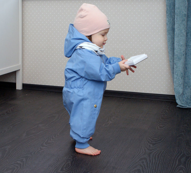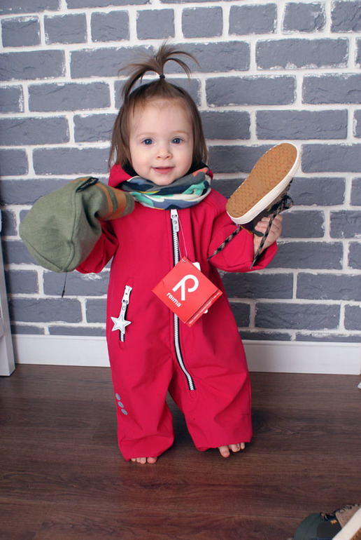 Моя прелесть. Весенний комбез Мини Родини. Планирую на теплую весну/холодное лето, но можно одеть вниз флиску, плюс мы часто на машине из тепла, в тепло, поэтому пользоваться начнем сильно раньше. Хочу к нему и снуд бледно-розовый купить, как шапка. Кеды Zara.