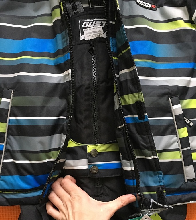 Молния прячется под ветрозащитной планкой, которая застёгивается на липучки, молния YKK, есть зашита от защемления подбородка.
