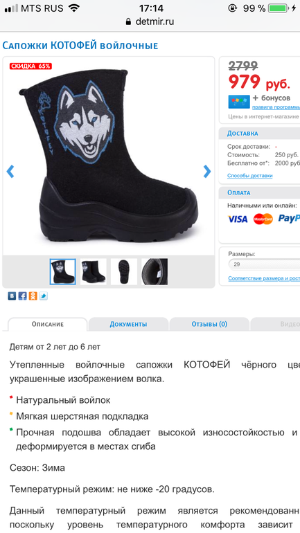 29 размер, валенки Котофей, чуть меньше 1000 рублей выходят.