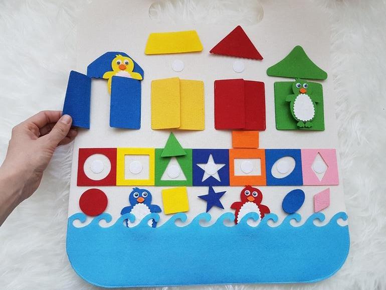 Фетровый коврик "пингвины". Тут сортировка по цвету. Фигуры. И просто игры. Мы пингвинам сразу дали имена - Мими, Лоло, Пепе и Додо. Она их запомнила и играла буквально везде.