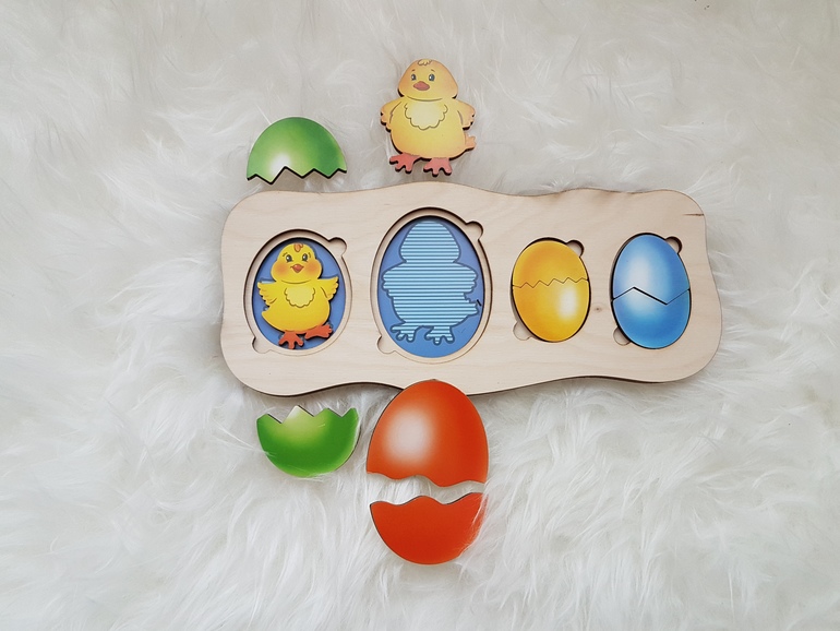Рамка-вкладыш "цыплята". Тут два слоя: цыплята и скорлупа. Все разного размера, формы и цвета.