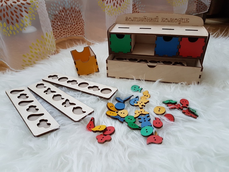 Волшебный комодик. Чудесная вещь. Тут сортировка по цвету и возможность выкладывать фигурки в плашки. Да и под другие игры можно примостить такой комод)