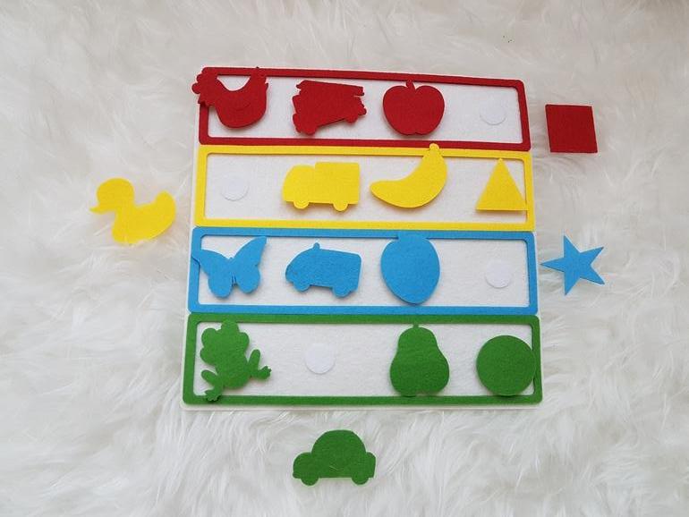 Фетровые рамки. Сортировка по цвету. Можно играть на смысловую сортировку - фигуры, транспорт, фрукты, животные....