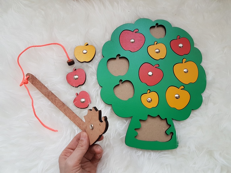Магнитная рыбалка. Только ловим яблочки. Можно ещё ежа поймать. Яблоки можно сортировать по цвету. Проговаривать размер. Когда нужно выложить яблоки обратно на дерево даже я не всегда угадываю размер)
