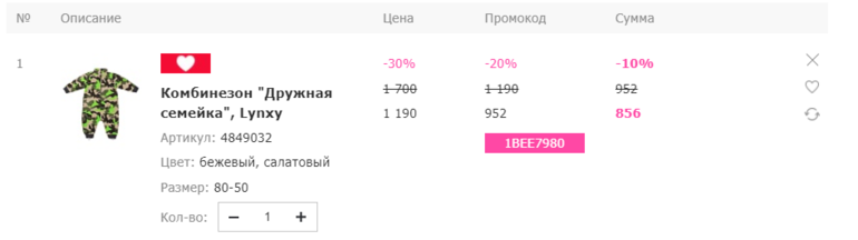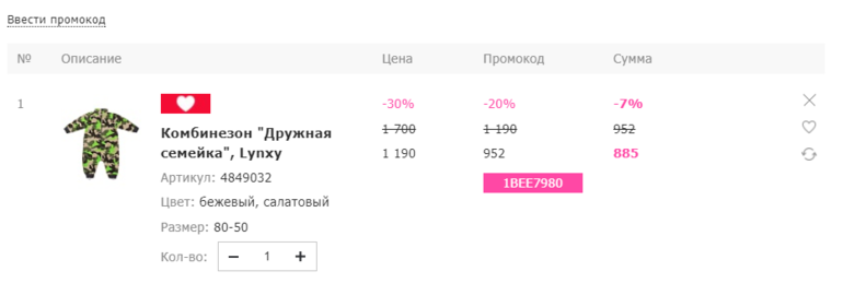 1029 руб. Скидка постоянного покупателя действует не всегда и не на все бренды. В данном случае только 7% скидка действует и промокод 7%. Промокоды автоматов в корзине проставляются.