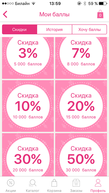 Там система такая, что баллы начисляются даже просто за посещение сайта, потом за заказы в зависимости от суммы заказа. И потом в зависимости от количества баллов, можно выбрать скидку. Если более менее часто заказывать, то не 10 лет копить)))