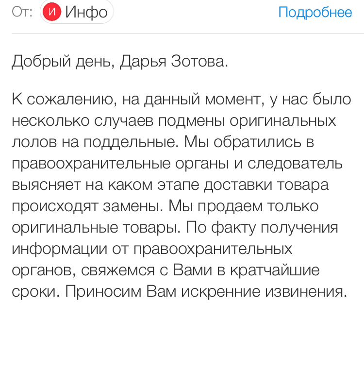 Девочки ,делала заказ кукол LOL через Goods в магазине Покупалкин ,и посмотрите ,что пришло L Q L,подделка !!!Была в полном шоке !Позвонила ,сказали первый раз такое ,а в письме уже обратное !Пригрозила им статьёй о мошенничестве ,что напишу заявление !На что они написали ,вот такую чушь,даже интересно как они это сидели придумывали.Да кому они нужны ,наверно курьер поменял !?В общем испугались !!!Трепали нервы 2 дня,мол руководство решало,что делать!Обещав перезванивать ,этого естественно не делали!Пришлось самим ехать на другой конец Москвы сдавать это полное Г!!!Деньги хотели вернуть после сдачи в течении 10 дней на карту ,хотя я платила наличкой и на сайте у них прописано ,как платили так денежные средства и возвращаются.Сказав это оператору,без предупреждения оставили на линии,через пару минут соизволив появиться По хамски было отвечено:Получите на пункте самовывоза деньги !!!При том сдав товар ,и наличными они возвращают так же в течении 10 дней и пришлось бы опять ехать туда забирать!!!Мне вернули сразу .