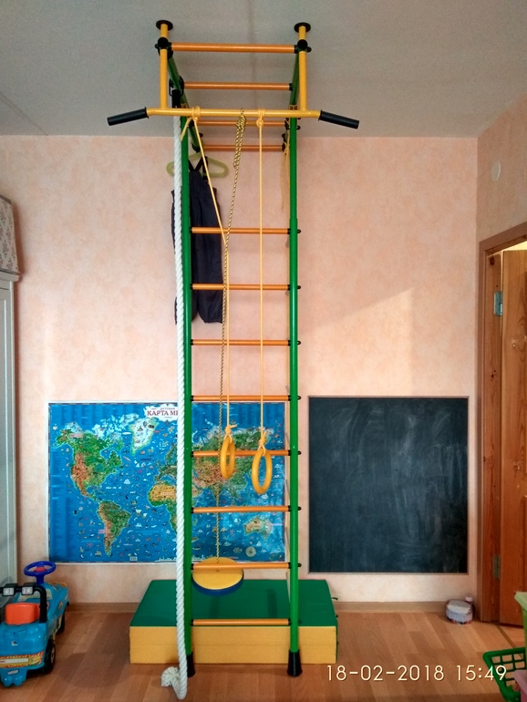 У нас комплектующие фирмы Романа, модель собирали по моим чертежам. Нужно учесть, чтобы раскачиваясь на канате, кольцах, тарзанке, веревочной лестнице ребенок не прилетал в стены или шкаф или опоры спорткомплекса при раскачивании. У нас вот в опоры прилетают, не знаю, как этого избежать.