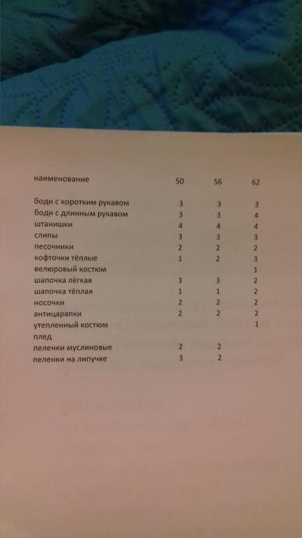 Для меня самая удобная одежда до полугода- это слипы. Штук 8 мне хватало. Плюс пара теплых слипов, из флиса. Несколько песрчников и боди, пара штанишек. Около 10 пелёнок. И одеяла различные по теплоте. И 50 размер- это если совсем маленький малыш. У меня по УЗИ большой был, я 62 брала почти все.