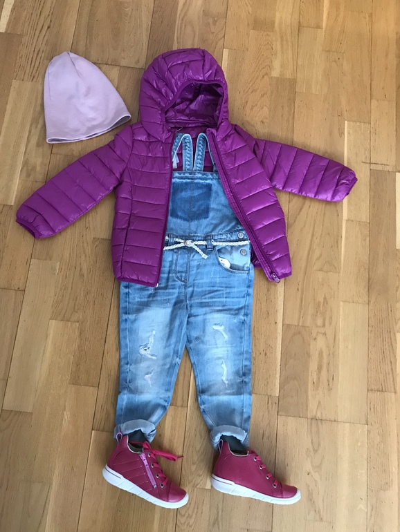 Куртка Бенеттон (досталась мне за бонусы в местном магазине менее чем за 1 тыс. руб.). У нас такая уже была в "колясочном" возрасте, очень нравилась, теплая, легкая. Решили взять опять. Ботинки кожа на коже Экко (Вайлдбериз 3500 руб.), тоже уже были подобные, очень нам нравились. Комбез Некст, из новой коллекции 1700 руб., я в восторге. Дырки не сквозные, джинса плотная, на теплую весну самое то. У кого девочки пухленькие, пузатые - отличный вариант, на наше пузо супер сел и даже запас есть. На худышке повиснет!