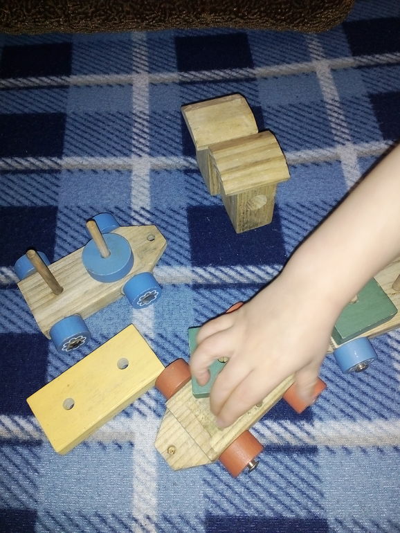 У нас сейчас в фаворе игрушка моего мужа ( ей уже 34 года! О Боже!) - деревянный паровоз. Мама нашла у бабушки на чердаке, обмыла насколько это было возможно. И теперь без этих деревяшек никуда!)))