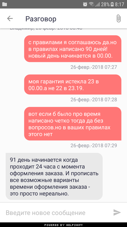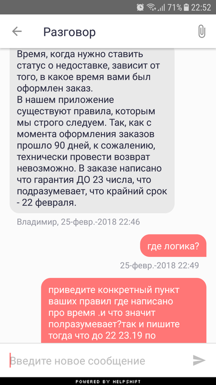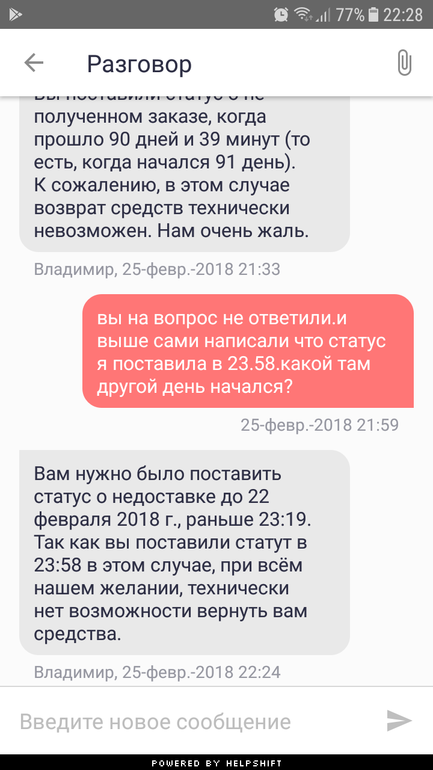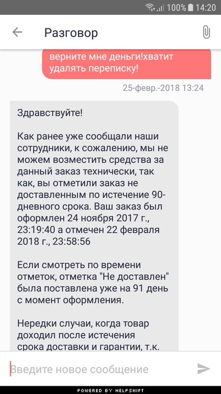 Далее мои вопросы стали игнорить.а 25 утром снесли всю пепеписку оставив лишь старые сообщения)