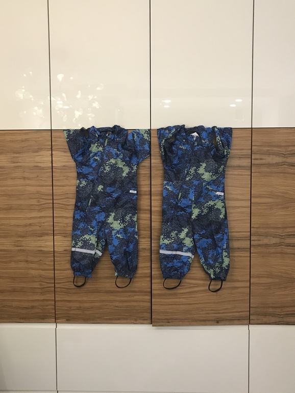 Я беру мембрану ветровочную, софтшелл на флисе и висит новый резиновый полукомбез, но я не уверена, что он нам понадобится, купила его по инерции, раньше сын носил). Раньше резиновый я на сына одевала поверх обычного комбеза, когда весной и осенью была грязища: не хотелось застирывать комбез. Резину под душем споласкивала и ок. При более тёплой погоде надевала резину на штаны: сын любит на беговеле по лужам кататься и от промокания такой полукомбез спасает хорошо, 2 часа по лужам, когда забрызгана спина, всё седло беговела и район промежности комбеза из-за этого, мокрые штанины, софтшелл все таки начинал промокать. Летом редко использовали: опять же, только по глубоким лужам на беговеле, просто в мокрой песочнице и с горки кататься жарко. Этим летом сыну уже 4 года и я не уверена, что резина вообще понадобится, кроме катания по лужам, надеюсь, он уже сам не будет уделываться как поросёнок на прогулках. В садик точно резину одевать не стану, это слишком сложно) Резина была Рейма, Дидриксонс и вот висит Се ла Ви, по мне, так они все одинаковые. Софтшелл был только Name it, по соотношению цена-качество он оптимален, часто скидки на WB бывают. Ветровочную мембрану беру Reima, потому что показатели хорошие, если попроще, то сын потеет, проверено, и опять же, на распродажах цены адекватные.