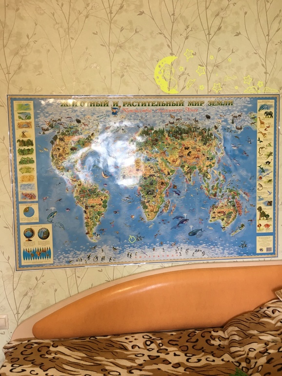 Это крутая карта. Купили этим летом, сыну ещё 5 не было, так повесить не можем. Он постоянно в неё играет. Пароходы плывут, животные живут....Уже вся помятая и заклеенная. Хочу второй вариант на стену!