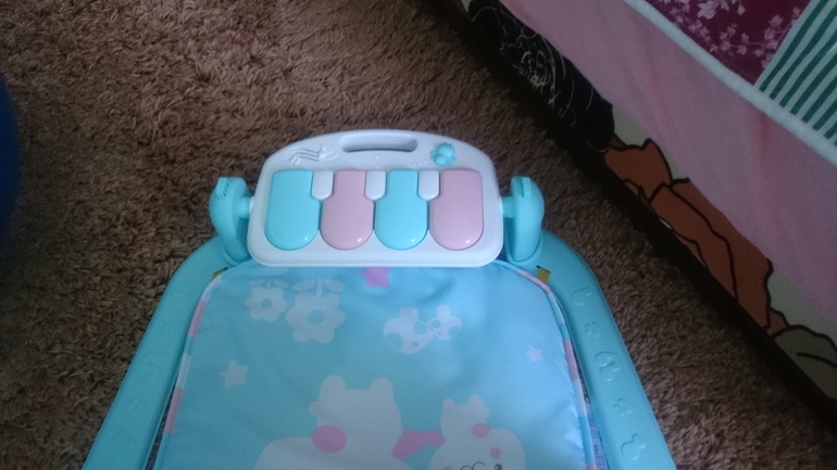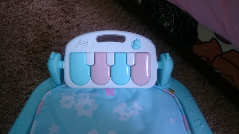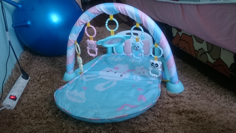 Подарили на 2 месяца нам такой коврик. Раньше я не хотела его приобретать, считала его бесполезным. Но так как подарили, мы его стали использовать. Да еще как использовать!!!! Это оказалась такая хорошая и нужная вещь 👍👍👍 Дочка сначала заинтересовалась погремушками, разглядывала их, болтала с ними. При махании руками задевает погремушки и сразу смотрит на них, т.к. Они очень удобно висят на уровне ручек ребенка Если попадают в руку, то тянет к себе, пытаясь попасть ими в рот 😆😆 даже начинает целенаправленно тянутся к ним рукой, но пока это получается плохо. Пианино имет 2 режима громкости и 3 режима звуков: просто ноты, музыка и какой то ужасный смех (3-х летней племяннице смех нравится больше всего). Так же пианино можно расположить просто вертикально, под углом (использовать, когда ребенок будет хорошо лежать на животе и играть ручками) и горизонтально (пользоваться, когда ребенок будет сидеть). Дочка нажимает ножками на пианино, пока конечно связи не поняла между ногами и звукам, но слушает с удовольствием. Еще очень любит свое отрожение в зеркальце по середине, улыбается ему и болтает😆