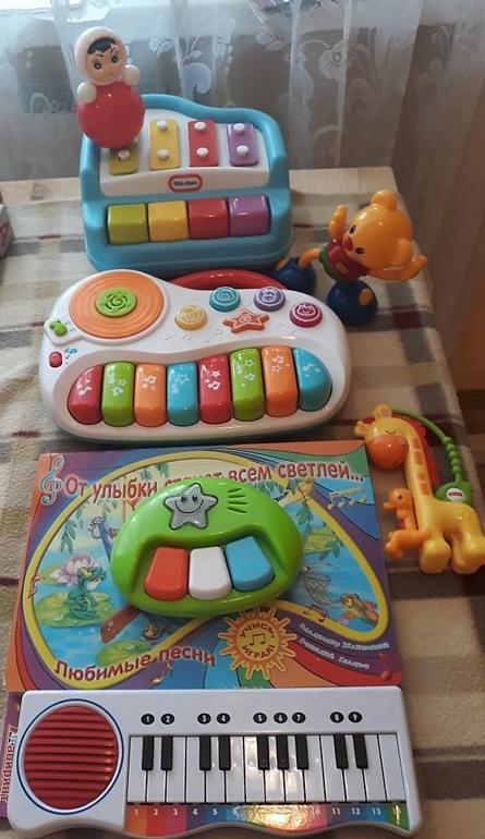 Первое механическое (с неваляшкой) досталось от брата) второе с животными покупается третьему ребёнку третий раз. Первое такое хватило двум и отдали, тк пополнения не ждали. Второе купили Косте и он его слишком активно использовал((( Интерес волнообразный к пианино. Малыш пока реагирует, но сейчас у Паши трехклавишное и механическое.