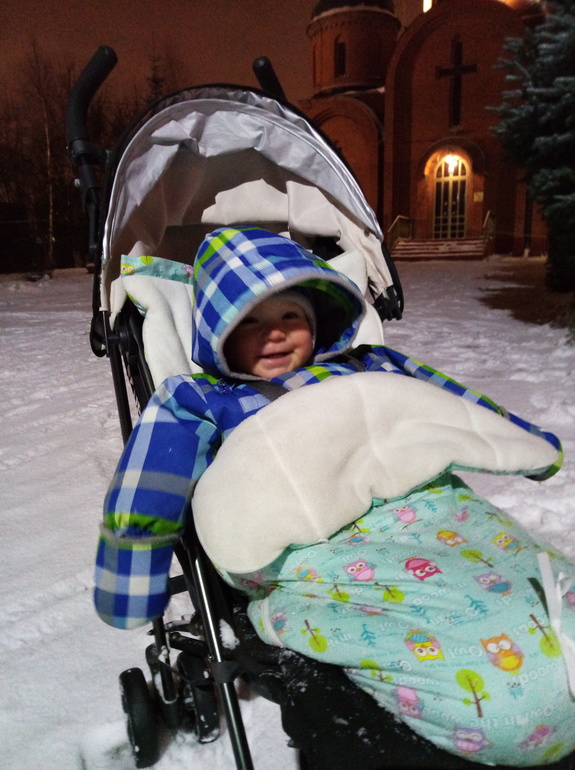 В зиму в возрасте 9 мес мы снова его использовали с большим наслаждением. И не смотря на то что верх у конверта - 100% плотный хлопок, на его судьбу выпадал и дождь, и мокрый снег. Сам хлопок становился мокрым, но ребенку под ним было сухо и тепло. Иногда я забывала к маме дождевик и приходилось устраивать ему настоящие испытания! Были бы санки - не сомневаясь прицепила бы его на санки!