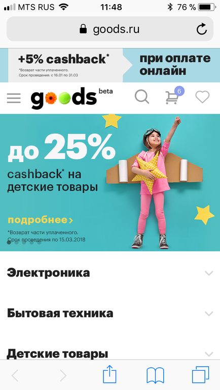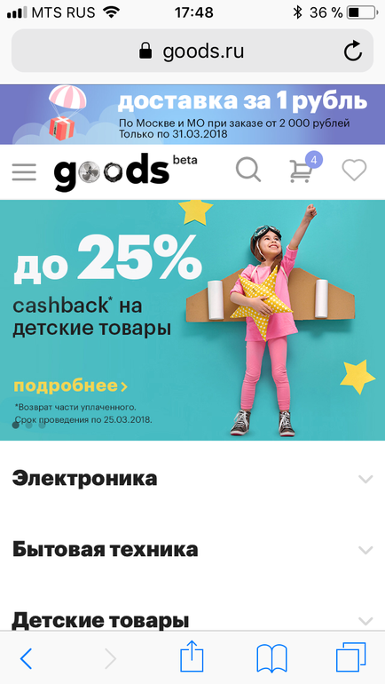 Наш «любимый» 🤢 Гудс продлил акцию 25% кэшбэк на детские товары до 25.03. Все замечательно, но есть одно «но»... Кэшбэк на самом деле не 25, а 20%. Это видно только в момент подтверждения заказа, а также в правилах акции, ссылку на которые высылает служба поддержки. В открытом доступе на сайте их нет 👎