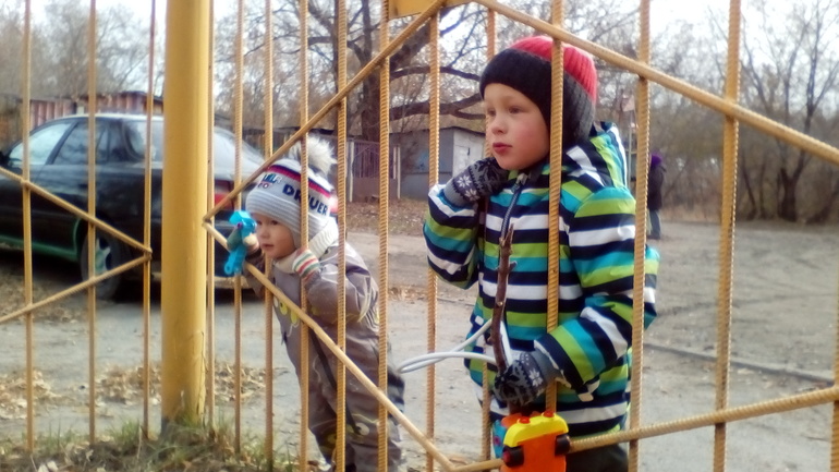у нас пока попа сухая. Катаемся на горках и на качелях.