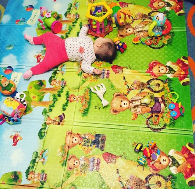 Ого, как не боялись оставлять) Я еще в 3 мес спустила на пол) Я лично не вижу смысла в дорогих ковриках, все равно малыш скоро поползет и будет лазить везде, кроме этого ковра. У нас обычный детский икеа, он как плацдарм для игрушек, но удерживать на нем дочу не буду)
