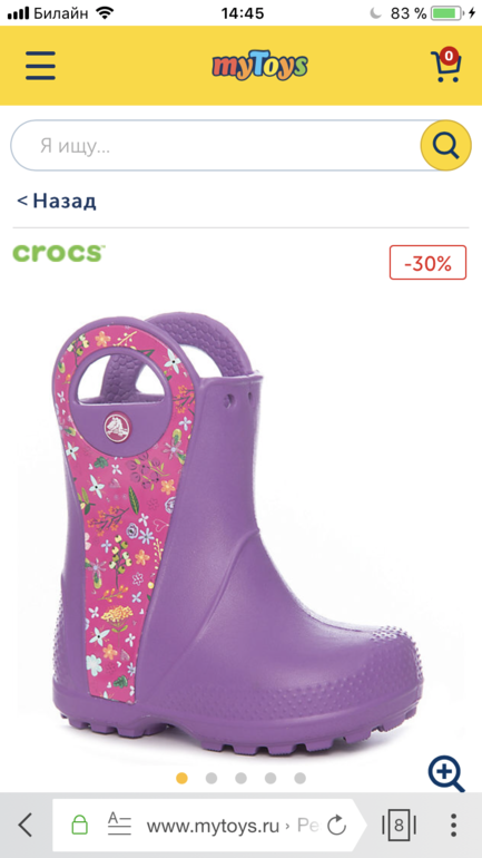 Сейчас распродажа крокс идет в Москве. Складская. Там есть сапожки однотонные, есть с Холодным сердцем, с человеком-пауком.