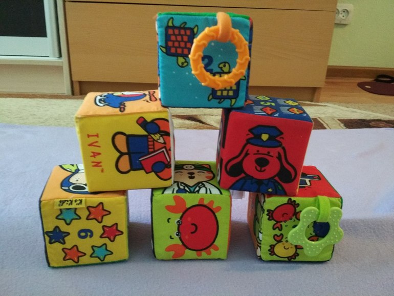 Всем привет! Я - мать с кубиками (и к сожалению, это не кубики пресса), которая задавалась вопросом, стоит ли покупать мягкие кубики за 2-3 тысячи. Хочу рассказать, чем дело кончилось и сердце успокоилось. Сначала я купила девятимесячной девице дешёвые "пробные кубики". Набор небольших пластиковых кубиков рублей за 200. Дочка играла с ними своеобразно: она скребла их ногтями, добиваясь препротивнейшего скрипа. Башенки, построенные мною, она огибала по широкой дуге. И всё. Полное равнодушие. Примерно в это же время небо (родственники) услышало мой вопрос о дорогущих кубиках и подарили набор кубиков-паззлов ks kids.