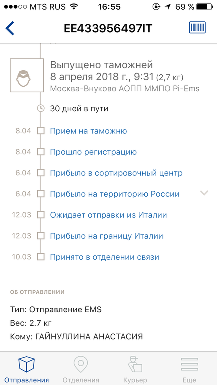 Добрый день! Как у Вас дела с посылкой? У меня сегодня движение началось) Я в пятницу письмо написала EMS Италии, не знаю может это помогло... если нужны адреса и текст могу в личку сбросить.