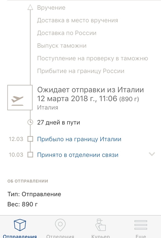 Заказ делала первый раз, может что-то не знала. Было указано, доставка 2-3 недели. Ну я как-то и забыла, а тут решила просмотреть трек, а там уже 27 дней, и до сих пор посылка ожидает отправки из Италии