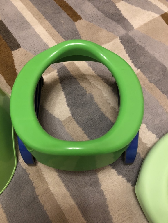 В сложенном и разложенном виде рядом с обычным горшком. Как накладка на унитаз- ну мелковата, конечно. Но для поездок и разовых пользований сойдёт