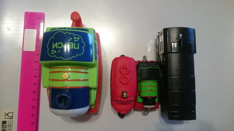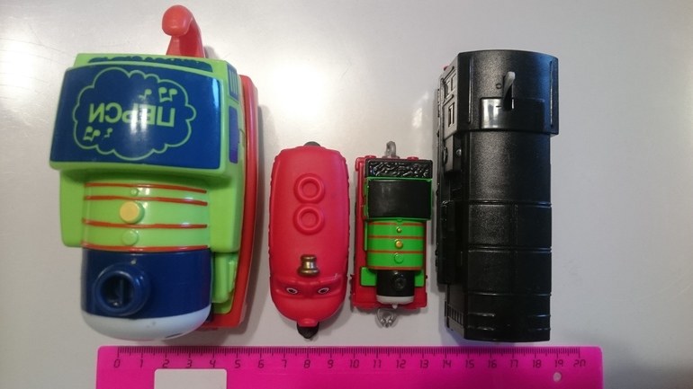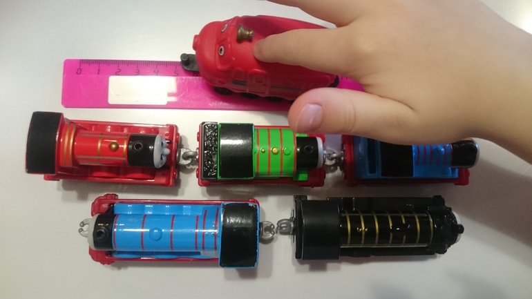 Зелёный по середине и крайний правый чёрный они из серии. Железные. Цепляются друг за друга. Но сынок умудряется за чёрный квадратный зацепить. Тот только ехать может от батарейки.