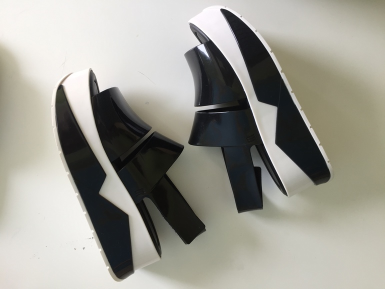 - в обуви из пластика Melflex можно смело попадать под дождь, так как материал отличается влагоустойчивостью. Их ботильоны вполне могут заменит резиновые сапоги.