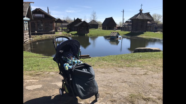 Это с конвертом от бугабу. Был очень холодный май 2017, а мы поехали в город Мышкино
