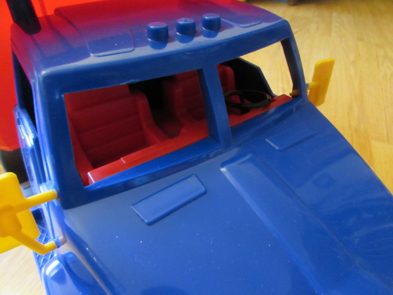 Большой 55см, но не слишком, играть с ним удобно. Качественный крепкий толстый пластик. За последнее время пересмотрела несколько аналогичных Полесье, Лена, еще что-то, так вот этот сделан крепче всех, в частности крепление кузова и колес надежнее. Реалистичный есть зеркала и ,даже, руль. Кузов вместительный, можно и воды налить, задний борт высокий. Но, все же, углы не скошены, так что для совсем малышей не подойдет.