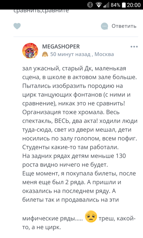 Это не для малышей представление...мои очень любят ходить в театры,цирки, но увы их это представление не зацепило вообще,младший так вообще сел спиной к сцене и рассматривал людей в зале. Лучше уж сходить в местный ДК