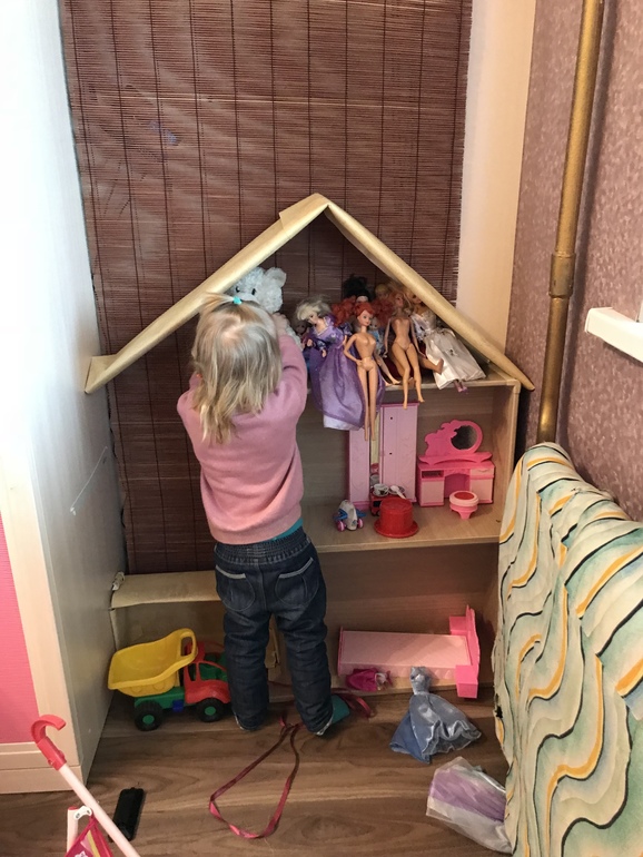 Самый простой вариант домика - купить икеевский Каллакс любого размера. Приделать крышу из фанеры и заднюю стенку, у которой каждую "комнату" окрасить или обклеить обоями разного цвета. Ванную можно мозаикой выложить. Покрытие на пол - в строительном магазине спросить, есть ли какие-нибудь ошмётки ковриков или ненужные образцы. Ну или на Али посмотреть, там ещё классная искуственная трава для игрушечного сада есть ))))