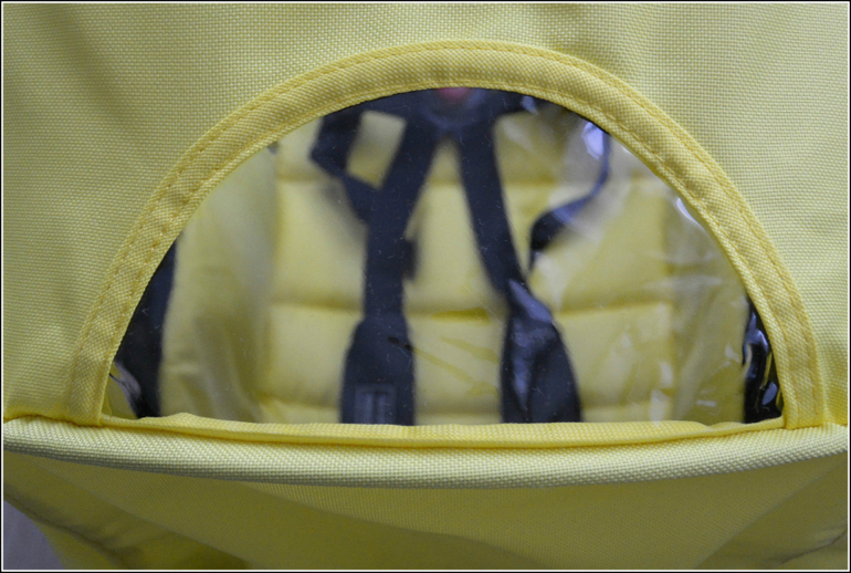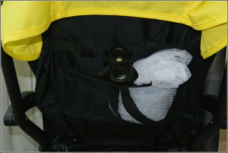 Со стороны везущего сетчатый карман, сверху он разделен на 2 части. Достаточно вместителен, т.к. дуга над ним жестко фиксирована. Так что кап вниз не утягивается.