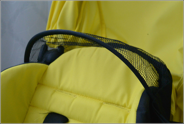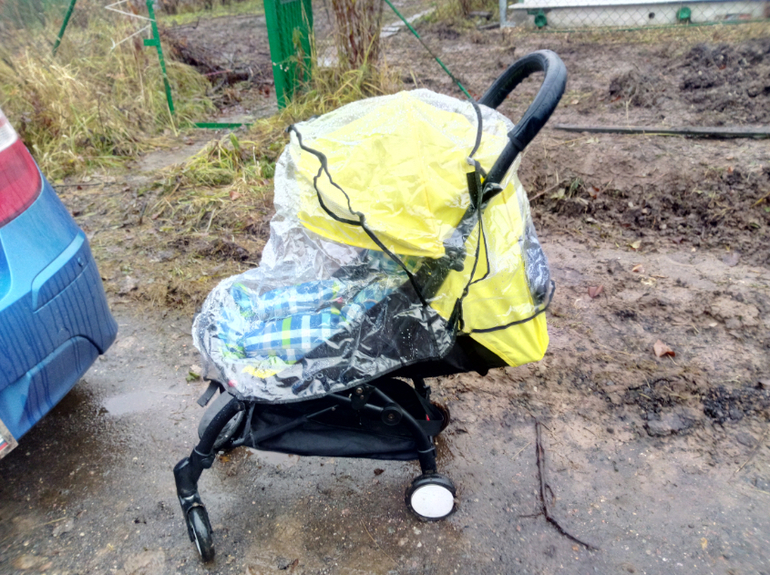 На первый взгляд "никакой" кап на самом деле весьма продуман и удобен как малышу, как и маме. Достаточно широкое окошко позволяет без труда увидеть, что делает даже самая крохотная лежащая лялька, но при этом солнце в зените не будет слепить, а кап отлично закрывает и от солнца, и от прямого дождя. Для косого и метели приложен скромный дождевик, но он закрывает только проем, а не всю коляску. Сидящего ребенка к сожалению совсем не видно, но надо ли оно.