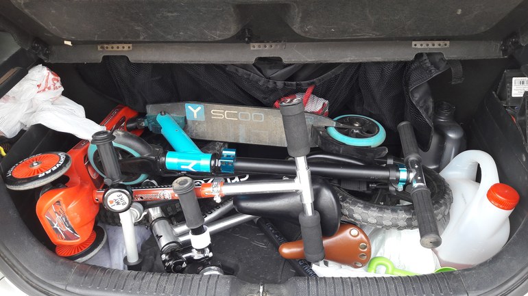 напомнило) 2 беговела,2 самоката, в салоне 2 пары роликов и 3 шлема и коляска)