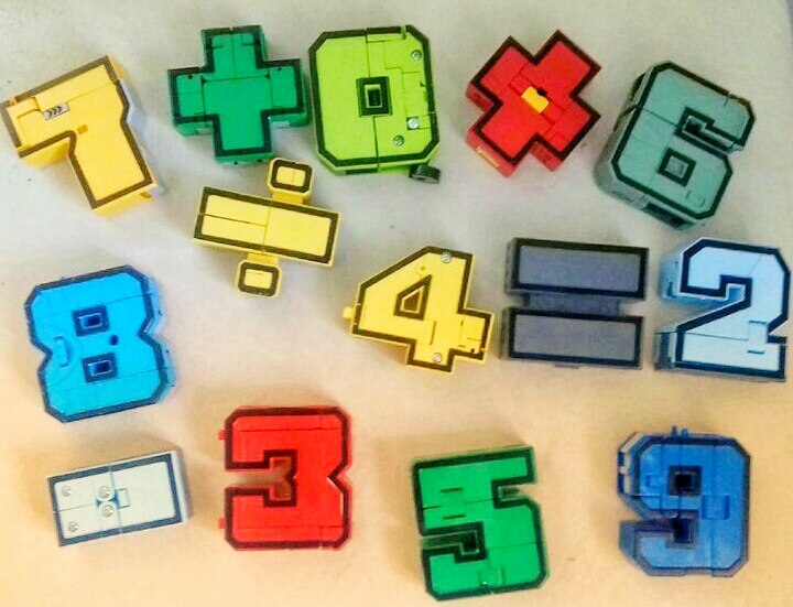 В наборе 15 деталей: цифры от 0 до 9 и знаки + × ÷ - =. Каждая из них превращается или в машину или в робота (за исключением знака =, он сделан как чемодан, в нем нож и пистолет чтобы вставить в руки роботам).