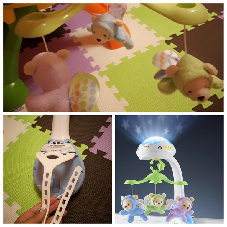 Крепление удобное, для кроватки безопасное. Когда сын в 4 месяца стал рукой тянуться к центральной светящейся кнопке и нажимать на нее (мелодии так переключаются), привинтила мобиль пониже, чтобы ему было удобно доставать. Когда сел и стал игрухи хватать, сняла сам мобиль, оставила только "магнитофон". Потом и его открутила, крепление убрала, а магнитофон малыш за ручку носит за собой. Каждый день просит меня включить звук (у самого еще силы в пальчиках не хватает переключатель сдвинуть).