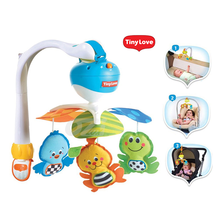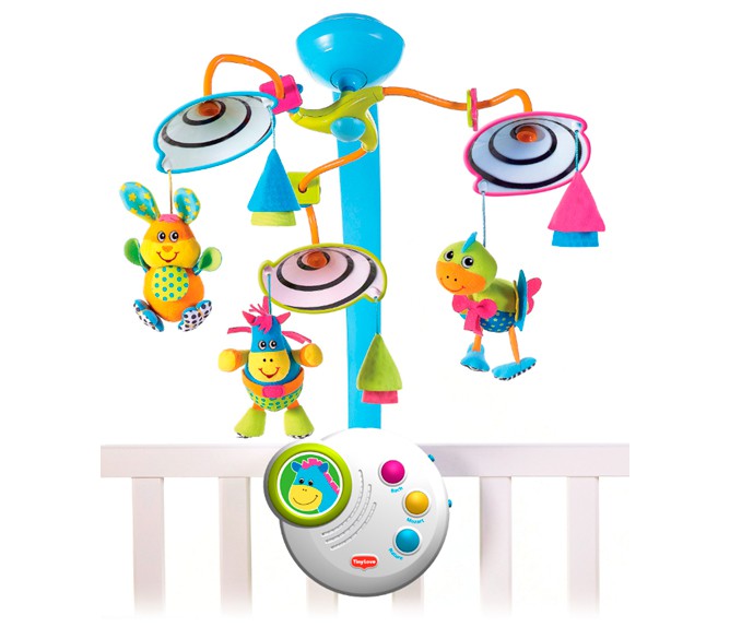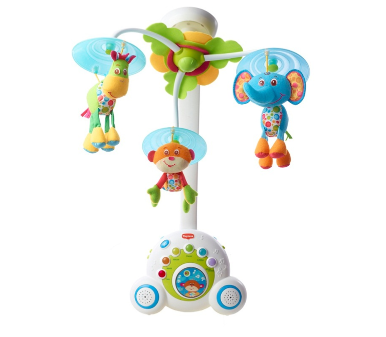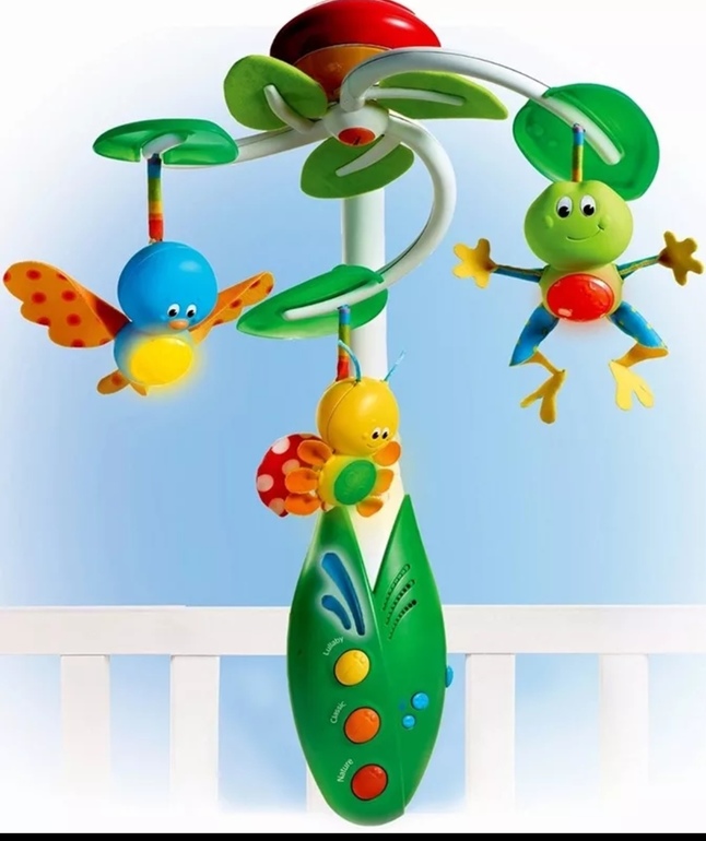 У нас вот такой был. Очень нравился. Зверьки при повороте на ребенка смотрят. Музыка приятная, громкость регулируется, можно совсем убавить звук и использовать как ночник (кругляшек по середине светиться), можно вообще свет убрать. Держатель с игрушками снимается (я на ночь снимала и оставляла только что б горел как ночник) и его можно использовать как бумбокс. Сейчас дочке 2 года любит таскать его (есть ручка) и слушать музыку. В общем очень хороший мобиль))))