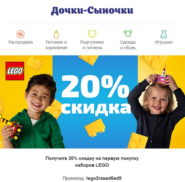 Распродажи. Скидки. Акции.Дочки сыночки прислали на почту промокод -20% на лего, строительная пластина дупло выходит 503 руб.