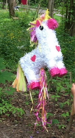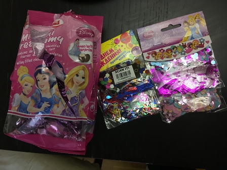 Еще очень хотелось мне пиньяту, взяла единорога в Веселой затее. Набивала тучей конфетти, конфетами в индивидуальной упаковке, и презентики положила - браслетики с Эльзой и Анной и йо-йо с котиком. С йо-йо промахнулась сильно - быстро развалились, дети начали делить уцелевшие... В следующий раз этот момент буду лучше продумывать. Хотела еще дуделки положить, но забыла... Конфетти брала фигурное с принцессами и надписями на Озоне (там цены как раз были на них отличные), браслеты там же (а то на сайте Затеи они только партиями продаются, а мне столько не нужно было). А еще было конфетти ассорти из Дон баллона - большие пакеты с фольгой разного цвета и размера, я так понимаю, это разные остатки и обрезки. Для объема отлично, только мелкие куски забились в конфеты, которые заворачиваются в фольгу. Если брать такое конфетти, то лучше использовать конфеты в упаковке со спайкой. Это лайфхак)))