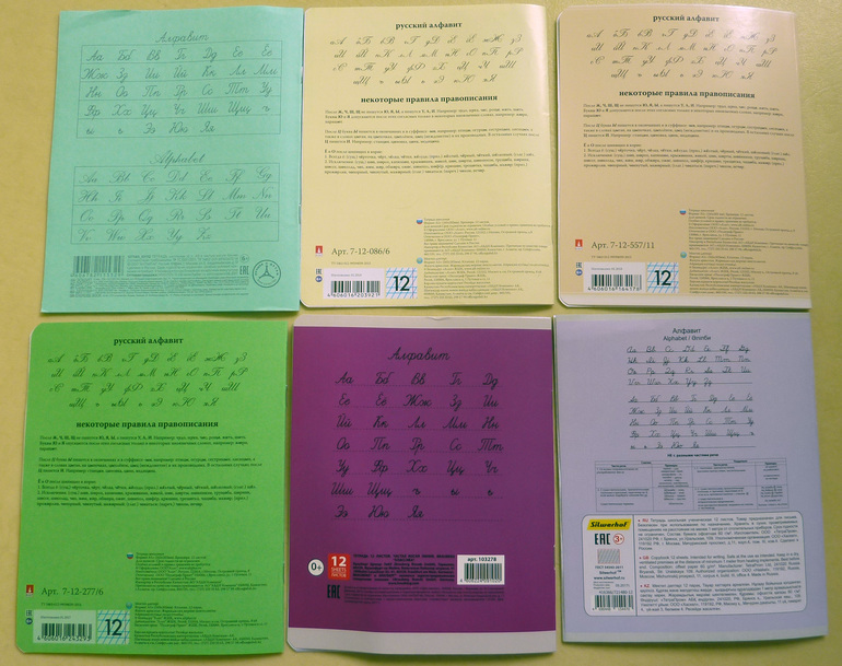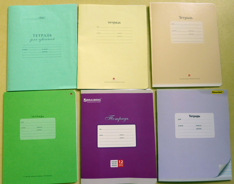 Отличаются и цветом. Хатбер - стандарт зеленый и без вариантов. Народная - желтовато-бежеватая. Люкс - бежевая. One color - есть зеленые, есть голубые (разные артикулы, можно выбрать). Брауберг - "в ассортименте", синий-фиолетовый-желтый-зеленый, если покупать пачку, то в пачке 20 шт по 5 тетрадей каждого цвета (может быть важно, если нужен один цвет для всего класса). Сильверхоф - в ассортименте (розовый, голубой, сиреневый, персиковый, мятный). Эрих Краузе - тоже ассортимент (розовый, голубой, сиреневый, желтый, зеленый).