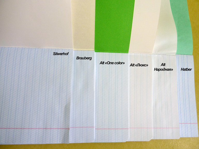 Главное отличие - в обложках. Хатбер - классическая зеленая бумажная, тонкая. Альт Народная - тонкая бумажная, но глянцевая-скользкая. Альт Люкс, Брауберг и Сильверхоф - картонная с глянцем сверху. Альт One Color - самый плотный и приятный картон, без глянца, тонированный в массе.